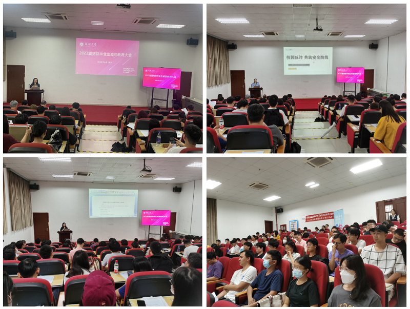 首先,曹警官以“校园反诈 共筑安防线”为题,与同学们讲解了电信网络诈骗、虚假购物诈骗、电商理赔套路、冒充公检法的诈骗、裸聊敲诈和虚假征信待诈骗手法的显现。之后,曹警官向同学们介绍了相应的防诈常识,并希望同学们要对于以上骗局,要不听、不信、不转账、不点击陌生链,装国家反诈APP等措施有效应对,筑牢防范诈骗的安全屏障。