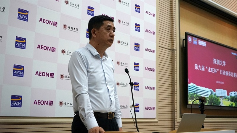随后,评委老师们对比赛进行了点评。杜若政彦董事总经理首先感谢这次的近距离交流机会,并赞扬深圳大学的选手表现优异,欣赏深圳大学的教育成果,表示永旺集团希望能继续为深大学子提供机会。连兴槟老师提到选手们在决赛的表现比初赛有了明显的进步,希望选手们在今后的各类舞台上能学会在同一个主题下如何能更多地展现附有个人特色的内容。多田真三子老师也希望选手们的演讲能有更多的原创性,例如针对本次的主题,如果能有独特的、具可行性的建议,或许能为永旺集团提供更有价值的商业参考。荒金慎之介董事表示选手们能用非母语流利演讲、即兴答题是值得称赞的,希望今后选手们也能应用日语为中日友好交流做出力所能及的事。张艳辉老师认为选手们在日常学习中应该注重积累、打好基础,这样站在演讲舞台上才不会紧张。长岛武德董事总经理最后也对比赛进行了总点评,表示在听完选手们的演讲后,他受益匪浅,认为中日交流是十分有意义的,世界具有多样性,交流才会使人与人之间的距离更加紧密。