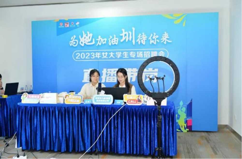 与此同时,招聘会现场同步开启“直播带岗”,西门子、全棉时代、亿道等五家单位的HR化身为“直播带岗”主播,通过“宣传展示+直播带岗”的形式,与学生进行深度交流。“带岗主播”针对求职者在线提出的问题,结合企业招聘职位和招聘政策进行详细宣讲和积极互动,求职者可以通过观看直播的同时进行线上提问、简历投递。“直播带岗”开拓了多元化求职渠道,助力企业对接女大学生快人一步,抢占先机。