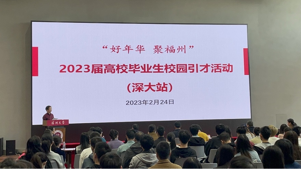 2023年2月24日,由中共福州市委组织部、福州市人力资源和社会保障局、福州市人才发展集团联合举办的2023年“好年华 聚福州”高校毕业生校园引才活动——深圳大学站,在深圳大学粤海校区校友广场二楼报告厅成功举办!深圳大学党委常委、副校长汪永成,福州市人力资源和社会保障局党组副书记、副局长张是全出席活动。