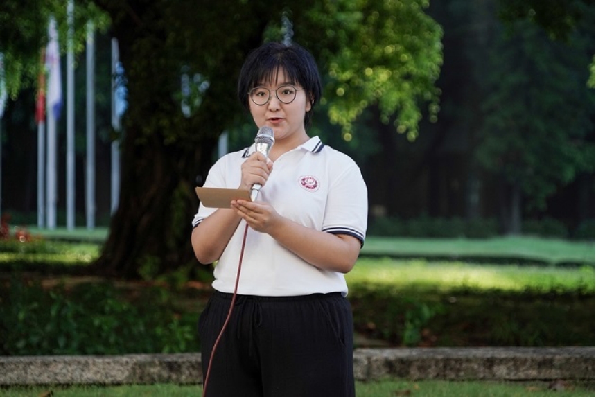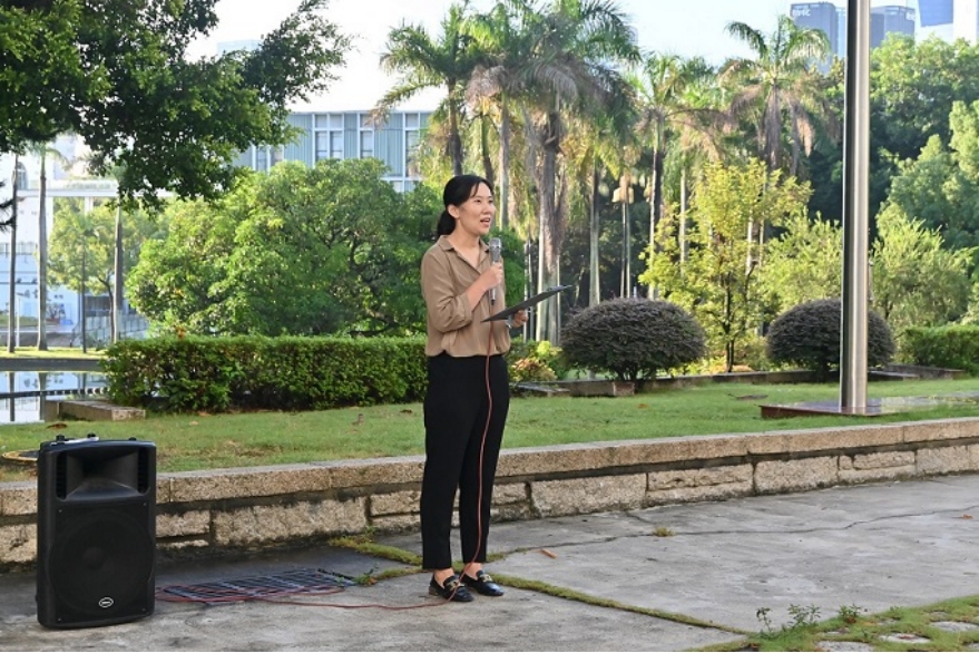 升旗完毕后,党委学工部副部长宋敏老师发表讲话。宋敏老师讲到,73年披荆斩棘,73年风雨兼程,中国共产党团结带领亿万人民创造了新中国波澜壮阔、惊天动地的历史,青年理想远大、信念坚定,是一个国家、一个民族无坚不摧的前进动力。宋敏老师希望同学们秉承“脚踏实地、自强不息”的深大精神,勤奋学习,开拓进取,以青春之名,喜迎党的二十大,不负韶华,不负时代,在青春的赛道上奋力奔跑,争取跑出当代青年的最好成绩!