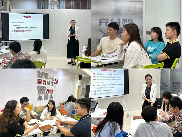 接着,弋灵老师分享了如何用教练技术探索个人的职业愿景,指出教练是一个支持个人和学生全面成长的过程,重点在于激发行动、引发学习、发挥潜能,使其拥有更为圆满、平衡、自我实现的生活。辅导员可以通过学习教练的信念、逻辑层次工具、生涯幻游等帮助自我和学生赋能和成长。在弋灵老师的带领下,现场参会的老师们以小组为单位,首先通过《我的八十岁生日》的生涯幻游练习,探索和分享了个人的生涯愿景,继而尝试运用教练技术中的逻辑层次工具分析和解决职业成长中遇到的困惑和问题。