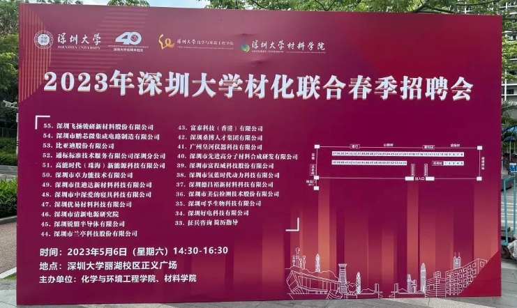 5月6日下午,深圳大学材化联合春季招聘会和银星科技园企业招聘会(深大专场)于深圳大学丽湖校区正义广场成功举办。材料学院党委副书记李小平、化学与环境工程学院党委副书记徐晓玲、生命与海洋科学学院党委副书记毛斐,学院辅导员及学生部就业指导中心老师来到现场。