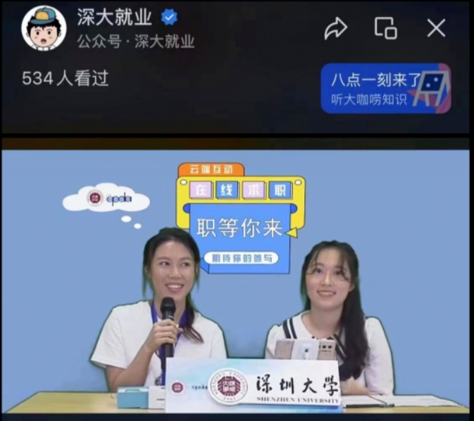 除了线下招聘现场,本次活动还有线上模式,“职等你来——直播带岗项目”同步在校园直播间进行。其中,深圳市英尔特供应链管理有限公司、金觅科技(深圳)有限公司、北京中资国恒实业集团有限公司和深圳新东方培训学校在线“直播带岗”,多样化呈现企业信息,吸引了众多同学在线观看,实现了学生与企业双向互动。