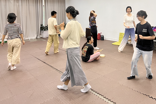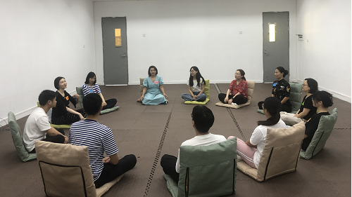 第二次课程以两人一组在悠扬音乐中进行的抚触按摩开场,随后通过即兴舞动、传球传掌游戏来回顾上次课程建立的联系,把大家拉回到团体中并加深了解。接着通过跳双人镜像舞和集体击鼓之舞让大家感受动觉的共情功能,了解感受个人在团体中的角色与作用。