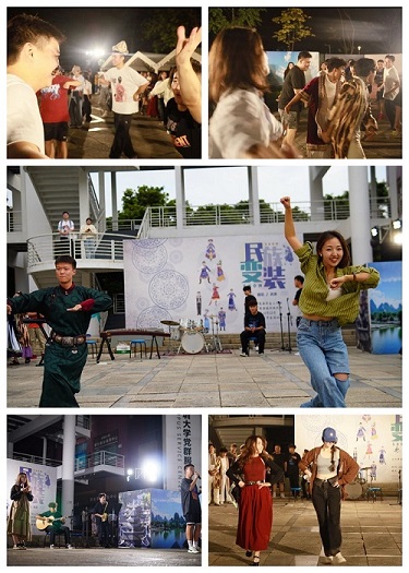 各民族学生围在一起载歌载舞。汉族、维吾尔族、哈萨克族、蒙古族学生即兴的舞蹈将民族艺术展现得淋漓尽致,由多民族学生组成的“意曲”乐队带来的《青花瓷》和《民族歌曲联唱》让观众体会到了不同文化元素的融合,多民族集体舞《萨玛》将现场气氛推向高潮。
