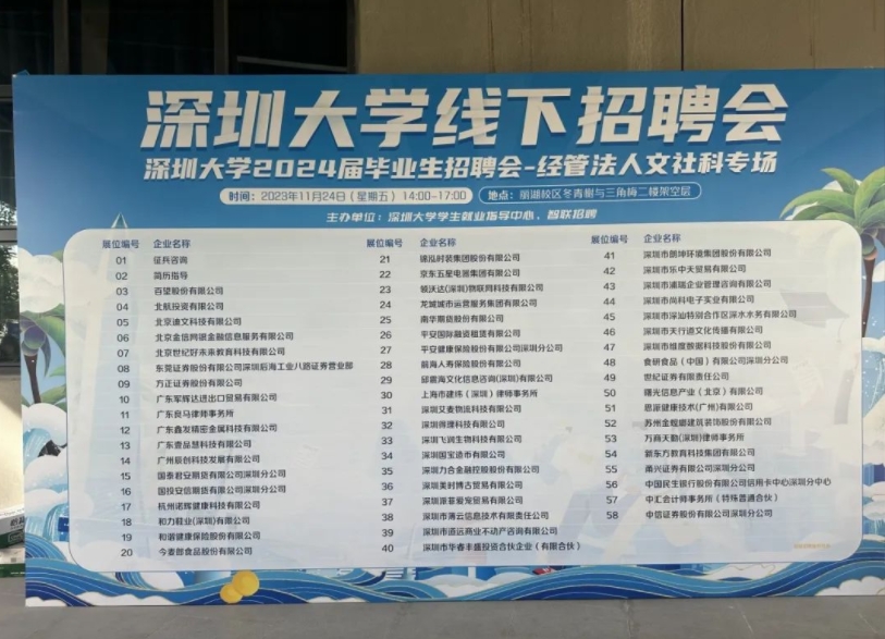 为促进我校2024届毕业生更高质量就业,搭建校企供需服务平台,我校联合智联招聘于11月24日下午在丽湖校区冬青树与三角梅二楼架空层举办了深圳大学2024届毕业生招聘双选会(经管法人文社科专场)。