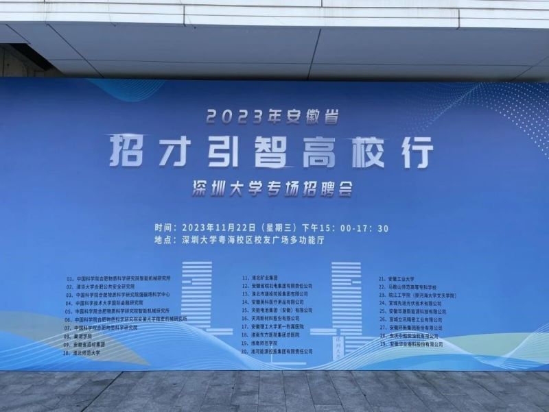 安徽省重要领导和企业代表于11月22日下午莅临深圳大学,举行了场宣讲招聘活动,为广大同学带来了众多高薪职位的机会。其中,参会单位包括中国科学院合肥物质科学研究院、清华大学合肥公共安全研究院、巢湖学院等9所安徽省省直企业事业单位以及淮北师范大学、宣城先进光伏技术有限公司、天能电池(安徽)等多所各市属企业事业单位。
