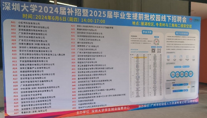 为推动我校毕业生更加充分就业,助力我校学生获取更多就业和实习机会,6月6日,我校于丽湖校区冬青树与三角梅二楼架空层举办深圳大学2024届补招暨2025届毕业生提前批校园线下招聘会。