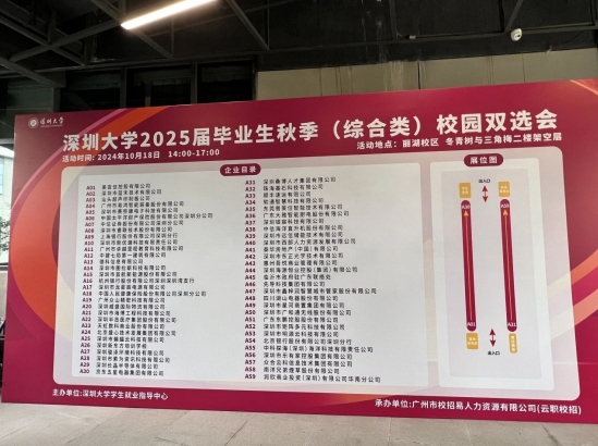 为促进我校2025届毕业生更好就业,我校于10月18日下午在丽湖校区三角梅与冬青树二楼架空层举办深圳大学2025届毕业生秋季(综合类)校园双选会。