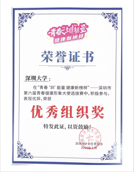 为积极响应《深圳大学进一步推动健康学校建设行动方案》的号召,践行“五育并举”的健康理念,深圳大学青春健康俱乐部及“青春同心 JU有范”青春健康同伴教育工作室高度重视此次比赛,作为深圳大学赛区的承办方,不仅广泛动员校内师生踊跃参与,更以卓越的组织能力荣获“优秀组织奖”。