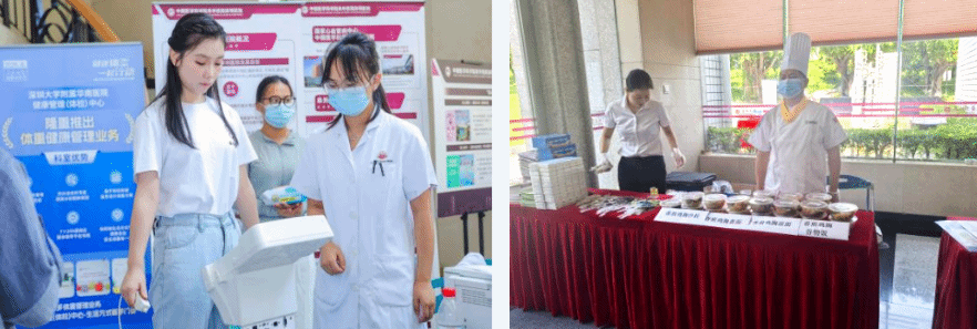 除了主会场区活动,本次宣传活动还设置了“健康互动摊位区”“打卡拍照区”等场外活动区域,各类既干货满满又生动有趣的健康问诊、游戏体验活动在寓教于乐中帮助市民提升健康观念,让学生、市民在游戏中“迈开腿”,走出“减重一小步”。其中,深圳大学附属华南医院健康管理(体检)中心将体重健康管理业务带进校园,引发现场参与者对“生活方式”医学门诊的极大兴趣。深大后勤保障部在健康饮食方面下足功夫,在食材、烹饪等方面为合理膳食提供“深大方案”。