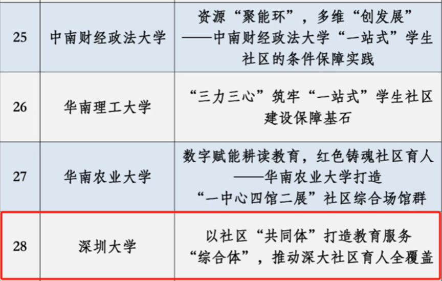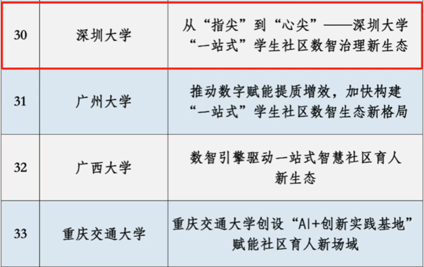 经高校推荐、专家评审等环节,每个版块择优遴选出约50个优秀作品。我校申报的《从“指尖”到“心尖”——深圳大学“一站式”学生社区数智治理新生态》《以社区“共同体”打造教育服务“综合体”,推动深大社区育人全覆盖》2项成果脱颖而出,成功入选。
