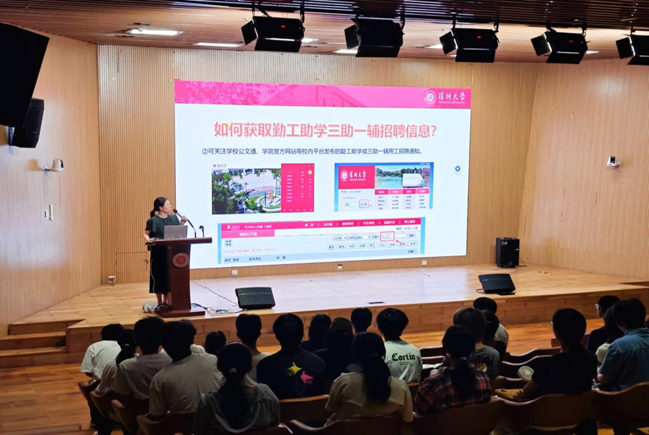 为提升学生对勤工助学及“三助一辅”活动的认知与实践能力,帮助学生快速适应岗位要求,落实资助育人实效,学生部学生资助中心于9月27日上午在粤海校区举办了2025年秋季学期勤工助学、“三助一辅”综合素质提升培训活动。学生资助中心李婧老师、原学生部学生资助与健康教育中心主任曾庆璋老师和信息中心创新部部长刘锐老师先后向到场的近百名学生进行培训。此次培训面向计划加入勤工助学、“三助一辅”或新上岗学生,内容涵盖全貌导航、基础办公素养与WPS AI实用技能,现场反响良好。