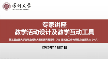 为提升我校职业生涯规划与就业指导课程教学质量,强化教师教学设计质量与引导学生深度参与的能力,加强职业规划大赛教学赛道备赛指导能力,2025年11月21日下午,教学活动设计及教学互动工具专家讲座在粤海校区校友广场307、丽湖校区守正楼B203会议室顺利举办。本次活动特邀华南师范大学马克思主义学院专任教师陈璐讲师担任主讲人,辅导员、教研室团队成员等教师参会,共同学习教学创新实践与课堂互动优化方法。