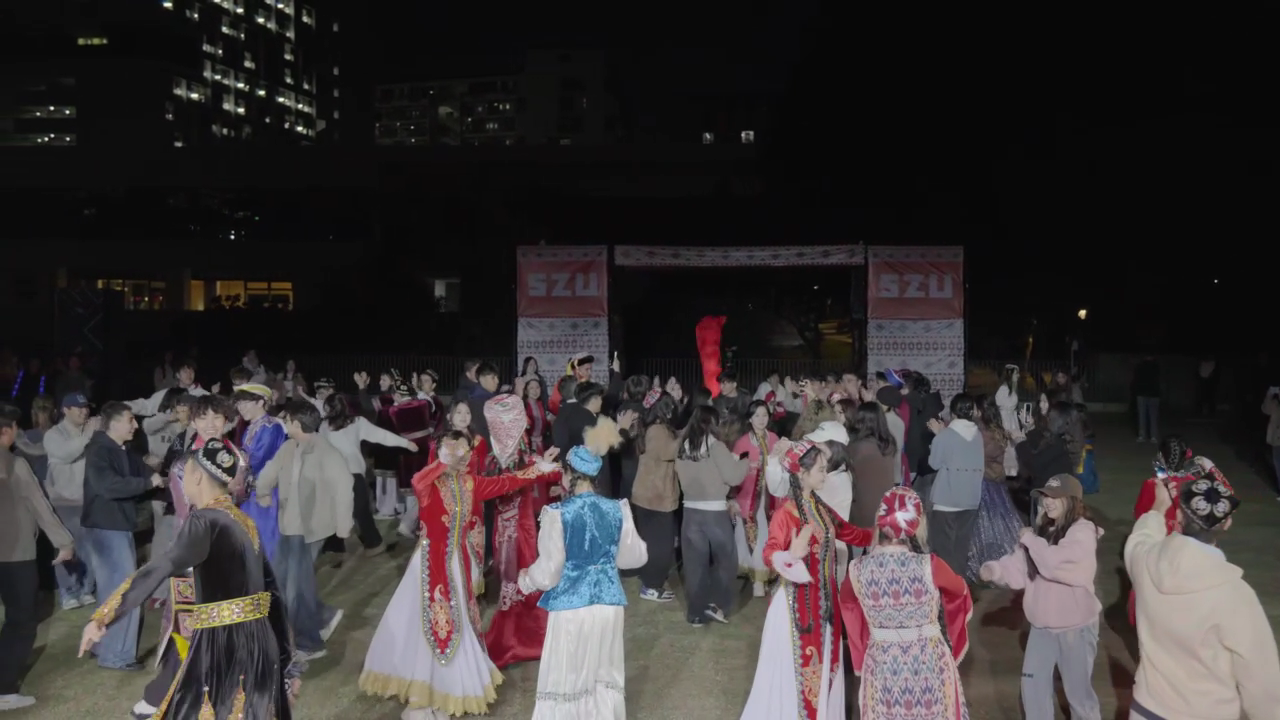 音乐会在温馨中接近尾声,同学们身着各式民族服饰与现场师生手拉手,围绕篝火形成同心圆,伴随欢快的乐曲共同起舞。火光跳跃,不同民族、学院、年级的师生在此刻心手相连,生动诠释了“中华民族一家亲”的深厚情感,也为整场活动画上了圆满而热烈的句号。