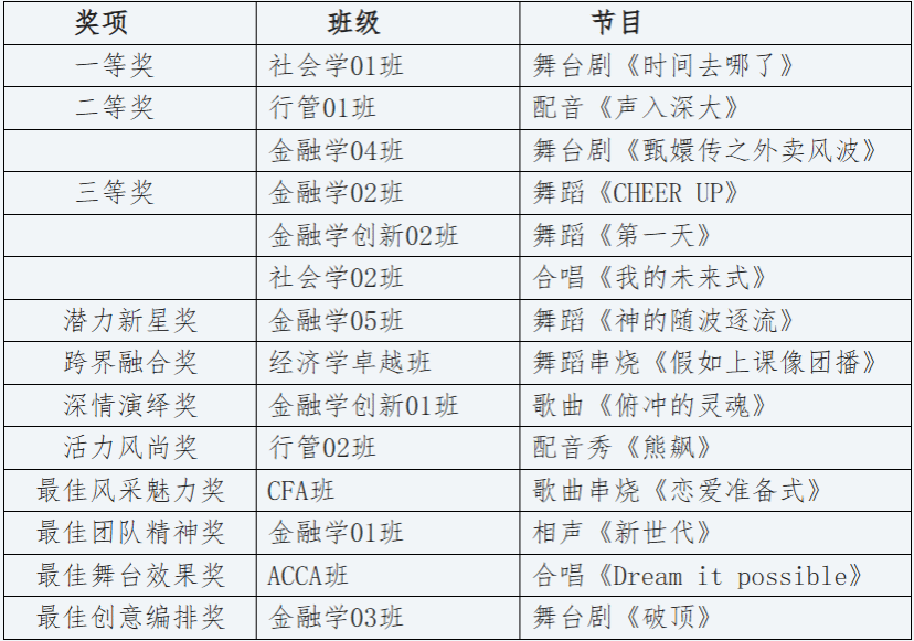 各班级节目沿 “坐标系” 次第绽放:“情感联结” 象限,金融学 04 班《甄嬛传之外卖风波》古今碰撞,CFA 班《恋爱准备式》唱尽青涩,金融学 05 班《神的随波逐流》传递欢悦,行管 2 班《熊飙》探情感深蕴;