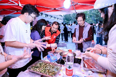 活动现场,多元体验区域同步开放,美食、游戏轮番上阵,现场热闹非凡。在“巧手包饺,共品团圆”区域,同学们自发组队分工协作,包饺子煮汤圆。大家互相请教技巧、分享心得,形态各异的饺子在欢声笑语中成型。热气腾腾的饺子出锅时香气四溢,师生围坐分享美食,热气氤氲间,“团圆”的寓意愈发真切,社区凝聚力在味蕾与情感的交融中悄然提升。