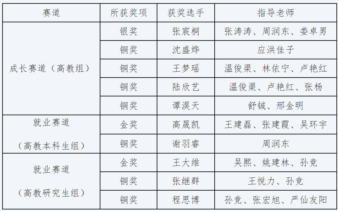 在此,向所有获奖的同学和指导老师表示热烈的祝贺!向为赛事组织、选手培育辛勤付出的各学院(部)、各位指导老师表示衷心的感谢!希望全校学子以获奖选手为榜样,将个人职业发展与国家战略、产业需求、区域经济社会发展相结合,树立科学的职业规划理念,主动开展职业探索与实践,在明晰发展方向中锤炼专业本领,在脚踏实地的奋斗中成就职业梦想!